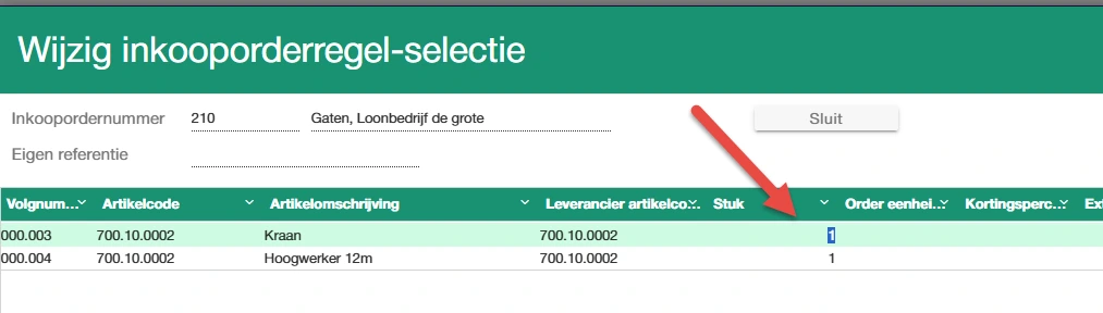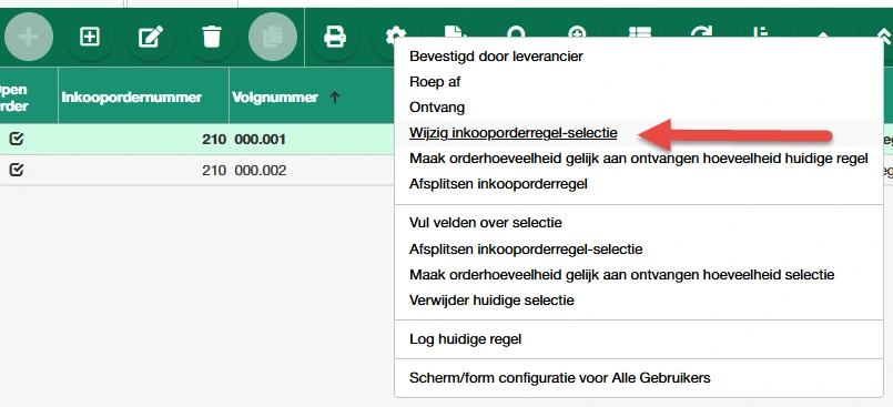 Ook aanpassen van de hoeveelheden kan heel eenvoudig. Kies bij de orderregels onder het tandwieltje voor Wijzig inkooporderregel-selectie.