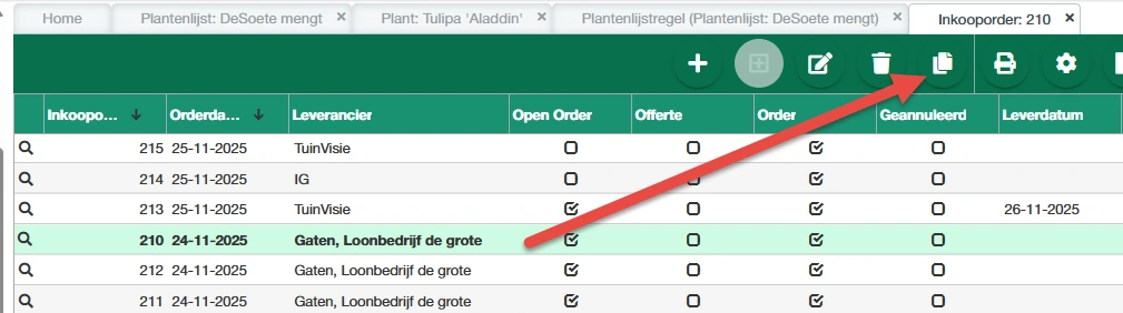 Voor een project wordt in week 10 een inkooporder gemaakt om bij een loonbedrijf 2 dagen kraan in te huren. Twee weken later zijn voor hetzelfde project nog een keer een paar dagen kraan nodig. Dan kan gewoon de eerste order worden gedupliceerd.